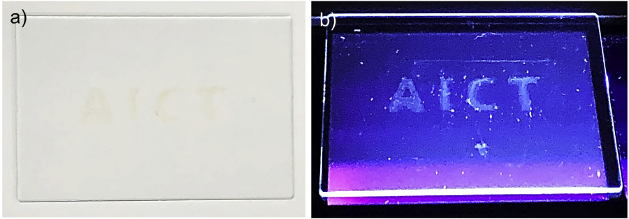 Figure 5. 在(a)可見光和(b)365 nm紫外線下沉積在玻璃基板上有字母的GQDs/TiO