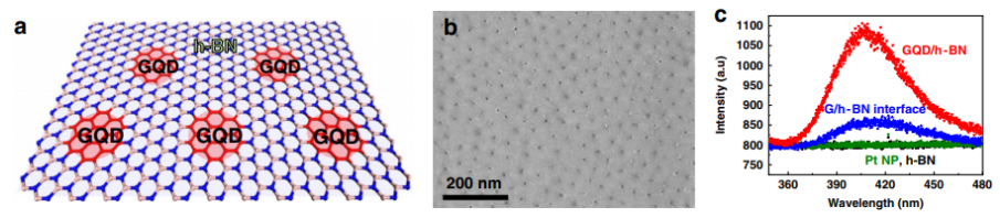 相關(guān)研究成果于2020年由韓國蔚山國立科學(xué)技術(shù)學(xué)院Hyeon Suk Shin 課題組,發(fā)表在Nature Communications (https://doi.org/10.1038/s41467-020-19181-2)上。原文:Blue emission at atomically sharp 1D heterojunctions between graphene and h-BN。