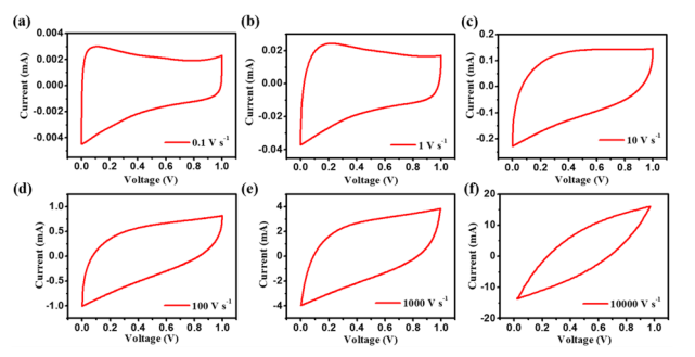 Figure 2. 基于5層5-AGNR薄膜所構(gòu)建的微型超級(jí)電容器的CV曲線(xiàn),掃描速率范圍從0.1至10000 V s−1,電位窗口從0到1 V。