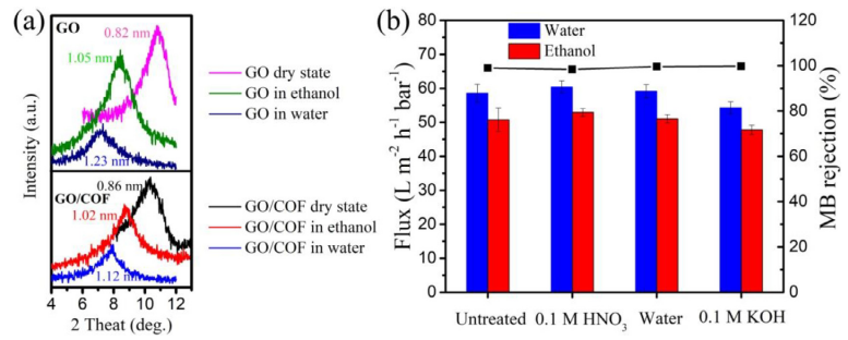 -1的甲醇和乙醇)滲透通量,在乙醇溶劑中的亞甲基藍(lán)(320 g/mol)和剛果紅(697 g/mol)的有機染料排斥率分別為99%和99.82%。此外,插入COF可以大大減少GO基質(zhì)的溶脹,從而在暴露于水以及強酸/強堿溶液時增強膜的穩(wěn)定性,從而在長期(48 h)操作中實現(xiàn)較高的過濾性能。