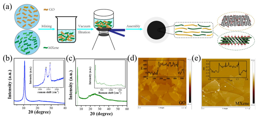 Figure 1. GO/MXene復(fù)合膜的制造工藝示意圖(a)。GO和MXene納米片的特性:GO(b)和MXene(c)的XRD光譜,插圖為相應(yīng)的拉曼光譜;GO(d)和MXene(e)的AFM分析。