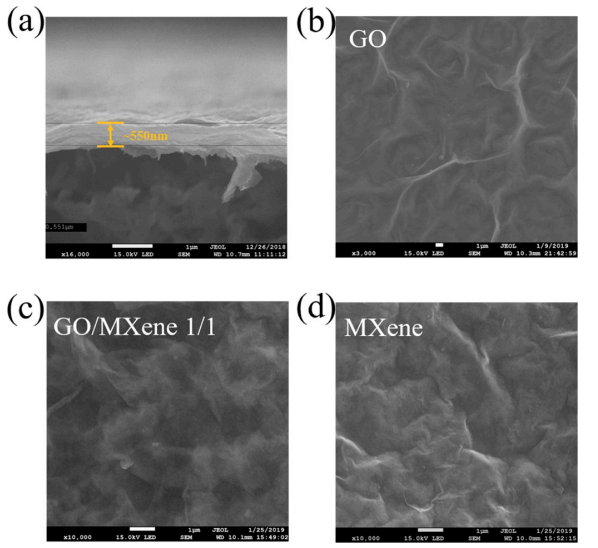 Figure 2. (a)質(zhì)量比為1/1的GO/MXene復(fù)合膜的橫截面,(b)GO的表面,(c)GO/MXene的表面和(d)MXene膜的SEM圖像(比例尺,1μm)。