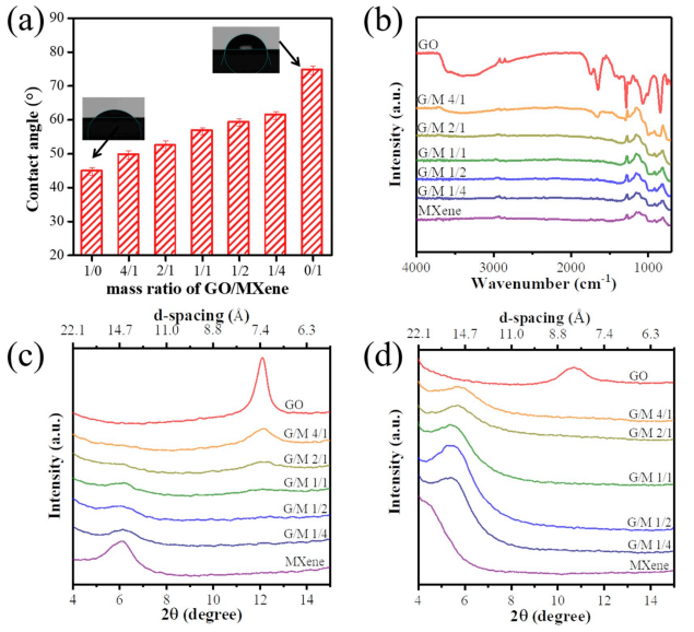 Figure 3. GO/MXene復(fù)合膜的理化特性:(a)水接觸角的變化;(b)隨著MXene含量的增加,GO/MXene膜的紅外光譜;隨著MXene含量的增加,GO/MXene膜在干態(tài)(c)和濕態(tài)(d)的XRD分析。