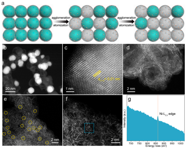 Figure 2. (a)微觀形貌形成機理示意圖。(b)HAADF-STEM圖像。(c)單個Ni NP,(d)石墨烯納米籠和(e,f)Ni SA的原子分辨率HAADFSTEM圖像。(g)在(f)中標記區(qū)域獲得的Ni L