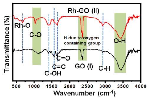 Figure 3. (I)GO和(II)Rh-GO納米復(fù)合材料的疊加FT-IR光譜,確認(rèn)酸功能化,隨后 Rh NSs修飾過(guò)程。