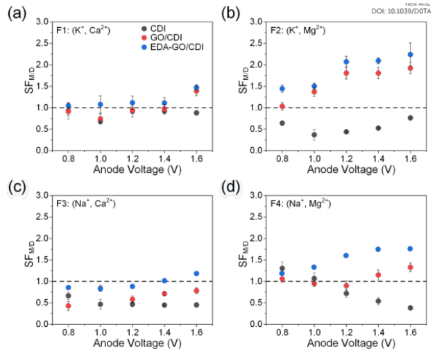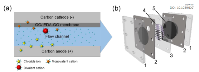 Figure 1. 通過GO/EDA-GO膜優(yōu)選吸附單價(jià)陽離子的示意圖。(b)CDI電池的分解圖以及各部分組件。