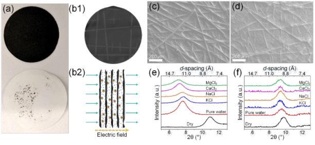 Figure 2.(a)從PTFE膜過濾器分離EDA-GO膜的照片。(b1)示意圖顯示了GO/EDA-GO膜。(b2)示意圖說明了隨電場變化,d-間距調(diào)制跨膜陽離子流動,朝相同的方向移動。(c)GO和(d)EDA-GO膜的SEM圖。(e)GO和(f)EDA-GO膜在干燥狀態(tài)下的XRD結(jié)果。