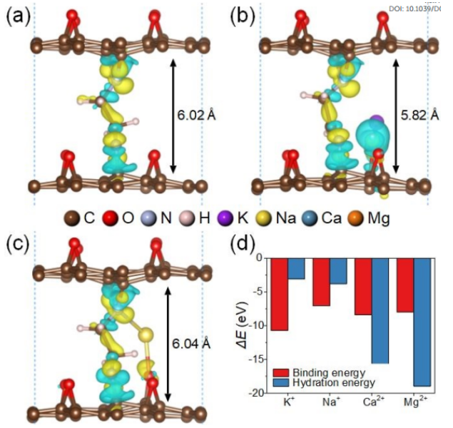 Figure 4. (a)EDA-GO結(jié)構(gòu)和(b)K +,(c)Na +吸附的DFT計(jì)算。(d)這項(xiàng)工作中計(jì)算的結(jié)合能與參考文獻(xiàn)的相比較。
