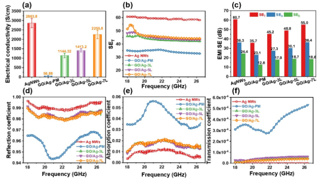 在軍事和民用領(lǐng)域,探索超寬頻電磁屏蔽材料,以消除來自電子設(shè)備的各種頻率電磁干擾,仍是一項巨大的的挑戰(zhàn)。這里,通過真空輔助自組裝,構(gòu)造了獨立式氧化石墨烯/銀納米線(GO/Ag-7L)膜,其具有密集的三明治狀結(jié)構(gòu)。與機械混合膜的隨機分布相比,多層GO/Ag-7L膜中,銀納米線被編織成3D導電網(wǎng)絡(luò)結(jié)構(gòu),具有出色的導電性(2255.8S/cm)。受益于GO的多層結(jié)構(gòu)具有多次吸收,以及銀納米線網(wǎng)絡(luò)的多次反射,在8-40 GHz的超寬頻范圍(覆蓋X波段,Ku波段,K波段,和Ka波段),其干擾屏蔽效率(EMI SE)高達62 dB(厚度僅為8微米)。相應(yīng)的比SE(EMI SE/t)高達77500 dB/cm。插入GO層后,GO/Ag-7L膜表現(xiàn)出出色的柔韌性和防腐蝕性能??紤]到實際應(yīng)用,可以將其用作新穎的應(yīng)變傳感器,具有高靈敏度和快速應(yīng)變響應(yīng),應(yīng)用于機器人,既滿足電磁干擾保護要求又滿足實時運動監(jiān)控。因此,它在精密的電子設(shè)備中具有廣闊的應(yīng)用前景。