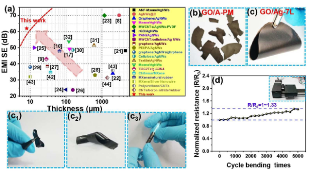 Figure 4. (a)該工作中的屏蔽性能和厚度與文獻中的值相比較,(b)GO/Ag-PM薄膜和(c)GO/Ag-7L薄膜的數(shù)字照片,(d)GO/Ag-7L薄膜經(jīng)彎曲5000次后的歸一化阻抗。