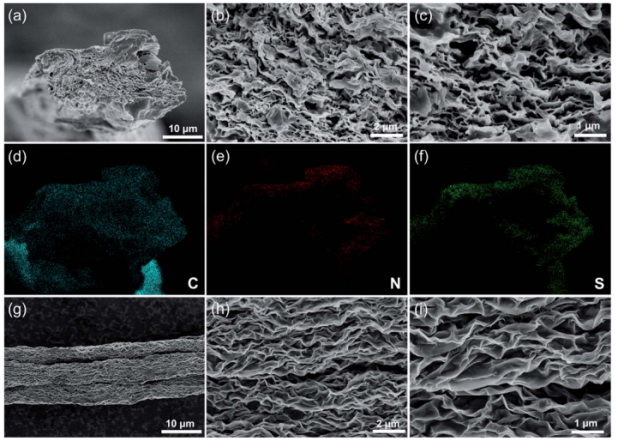 Figure 2. (a–c)多孔NS-GF的橫截面SEM圖像。(d–f)相應(yīng)的C,N和S元素映射圖像。(g–i)多孔NS-GF的表面SEM圖像。