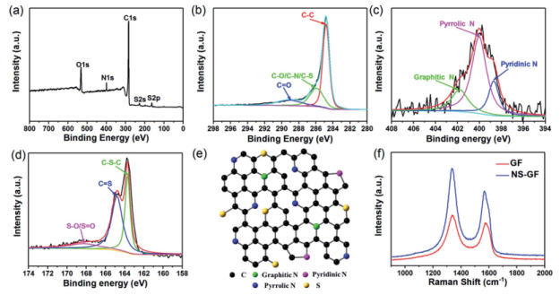 Figure 3.(a–d)NS-GF的XPS光譜。(a)總譜,(b)C 1s,(c)N 1s和(d)S 2p光譜。(e)NS-G的示意圖。(f)NS-GF的拉曼光譜。