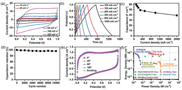 Figure 4. (a)NS-GF在各種掃描速率下的CV曲線(xiàn)。(b)NS-GF在不同電流密度下的GCD曲線(xiàn)。(c)在各種電流密度下的比電容。(d)循環(huán)穩(wěn)定性。(e)不同彎曲角度時(shí)的CV曲線(xiàn)。(f)Ragone曲線(xiàn)。