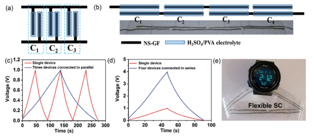 Figure 5. (a)并聯(lián)連接的三個(gè)SC的示意圖。(b)串聯(lián)連接的四個(gè)SC的示意圖和照片。(c)并聯(lián)連接的三個(gè)SC的GCD曲線(xiàn)。(d)串聯(lián)連接的四個(gè)SC的GCD曲線(xiàn)。(e)由串聯(lián)連接的帶電設(shè)備驅(qū)動(dòng)電子手表的光學(xué)照片。