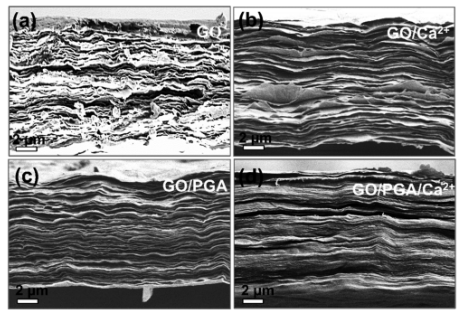 Figure 3. 珍珠狀薄膜的橫截面SEM圖像:(a)GO,(b)GO/Ca2 +,(c)GO/PGA和(d)GO/PGA/Ca2+復(fù)合膜。用Ca2 +溶液處理后,層狀結(jié)構(gòu)變得越來越致密。
