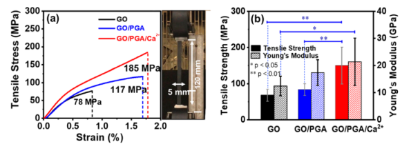 Figure 4. (a)通過單軸拉伸試驗(yàn)得到的GO,GO/PGA和GO/PGA/Ca2 +復(fù)合膜的典型應(yīng)力-應(yīng)變曲線。(b)GO(黑色),GO/PGA(藍(lán)色)和G /PGA /Ca2+(紅色)復(fù)合薄膜的拉伸強(qiáng)度和楊氏模量特性。