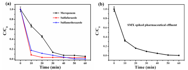 Figure 3. (a)通過(guò)使用SA-Cu/rGO/PMS系統(tǒng)催化降解各種抗生素和(b)降解SMX加標(biāo)制藥廢水