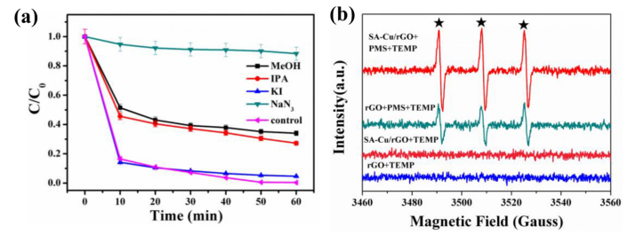 Figure 4. (a)在各種淬火條件下用SA-Cu/rGO降解SMX催化劑的淬火實(shí)驗(yàn);(b)rGO、SA-Cu/rGO、rGO+PMS和SACu/rGO+PMS系統(tǒng)的TEMP自旋阱ESR譜