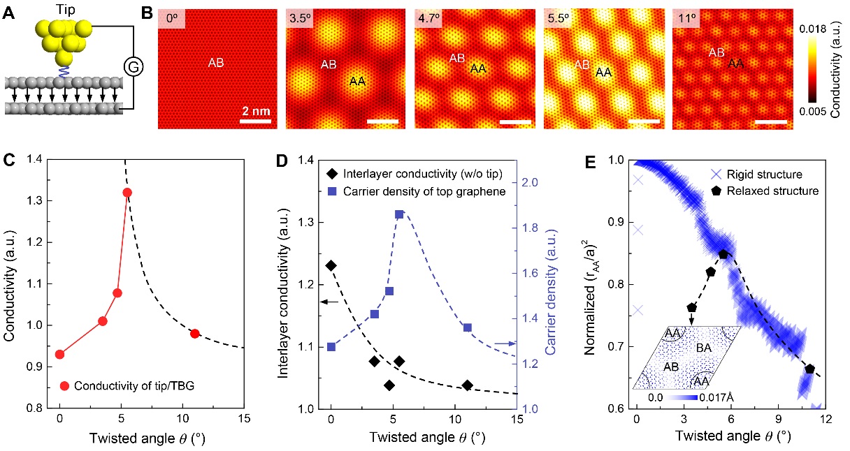 圖1. (A) 基于導(dǎo)電原子力顯微鏡(c-AFM)的扭轉(zhuǎn)雙層石墨烯電學(xué)測(cè)試示意圖;(B) 歸一化電流值(電導(dǎo))隨雙層石墨烯扭轉(zhuǎn)角度的變化