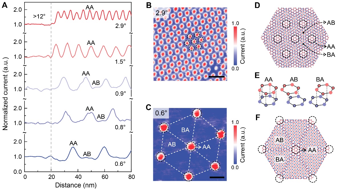 圖2. (A)不同扭轉(zhuǎn)角度雙層石墨烯表面獲取的歸一化電流曲線;(B)扭轉(zhuǎn)角為2.9°樣品表面的電流圖像;(C) 扭轉(zhuǎn)角為0.6°樣品表面的電流圖像;(D)-(F)對(duì)應(yīng)的原子堆垛示意圖