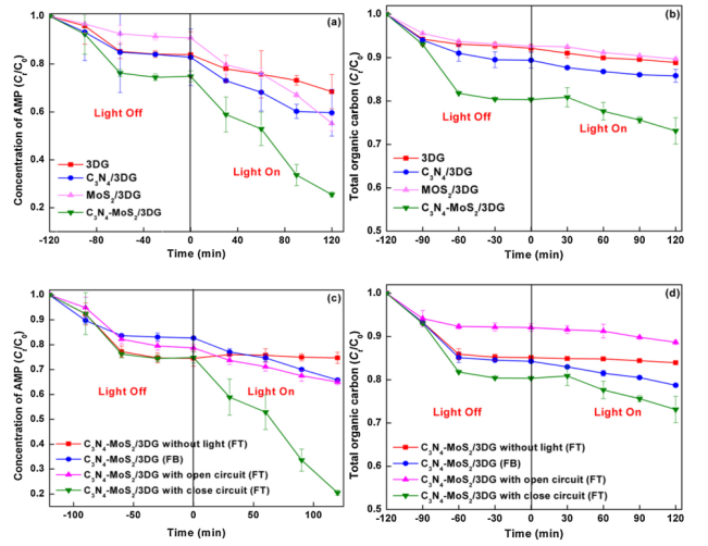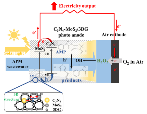 以三維(3D)光電極為光陽極,以Pt/C空氣呼吸電極為陰極,開發(fā)了增強的電子和質(zhì)量光催化流通系統(tǒng)。比較了3D石墨烯光電極上負載C