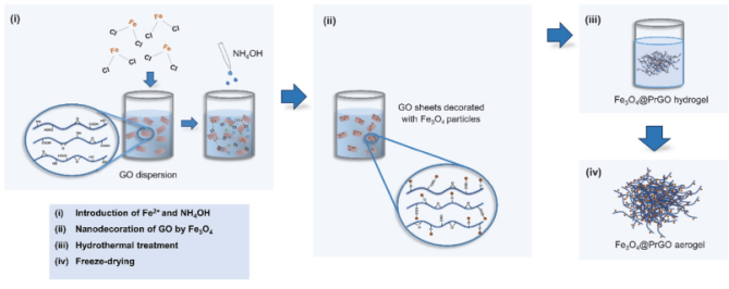 Figure 1. 該示意圖說明了Fe3O4@PrGO雜化氣凝膠的構(gòu)建步驟。