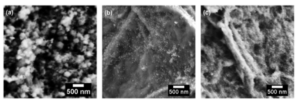 Figure 3. (a)裸露的Fe3O4納米顆粒(Fe3O4 NP),(b)超細(xì)球形Fe3O4顆粒修飾PrGO表面,(c)Fe3O4@PrGO氣凝膠相互連接的框架SEM圖像。