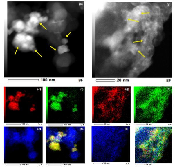 Figure 4. Fe3O4@PrGO的STEM圖像(a)原始電極,(b)100次循環(huán)后。EDX圖(c-f)原始電極,(g-j)100次循環(huán)后電極的元素分布。 Fe(紅色),O(綠色)和C(藍(lán)色)。 黃色區(qū)域是Fe和O共同存在的地方,對應(yīng)于電極上Fe3O4的分布情況。