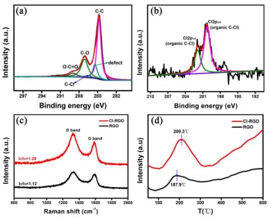 Figure 2.(a)Cl-RGO的C 1s XPS光譜。(b)Cl-RGO的Cl 2p XPS光譜。(c)RGO和Cl-RGO的拉曼光譜。(d)RGO和Cl-RGO的N2 TPD曲線。
