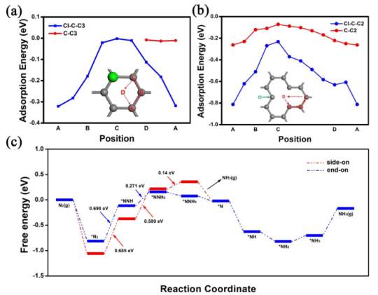 Figure 4. (a-b)N2在不同位置處的吸附能,綠色和灰色的球體分別代表Cl和C原子。(c)NRR反應(yīng)期間,在Cl− C-C2位置吸附N2時(shí)發(fā)生遠(yuǎn)端機(jī)制的自由能圖。