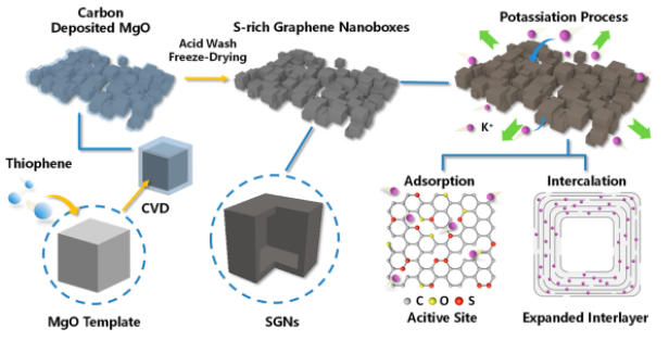 該研究工作由美國(guó)得克薩斯大學(xué)奧斯汀分校David Mitlin,中國(guó)海洋大學(xué)王煥磊教授課題組于2020年發(fā)表在ACS Nano期刊上。原文:Sulfur-Rich Graphene Nanoboxes with UltraHigh Potassiation Capacity at Fast Charge: Storage Mechanisms and Device Performance。