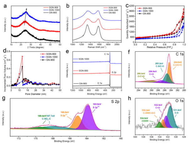 Figure 3. SGN-900,SGN-1000和GN-900的結(jié)構(gòu),組分和近表面化學(xué)特征。包括(a)XRD,(b)拉曼光譜,(c)氮吸附-解吸等溫線(xiàn)曲線(xiàn)和(d)相應(yīng)的孔徑分布。 (e-h)XPS光譜。