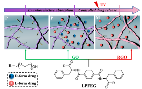 這里,介紹了一種超分子水凝膠,其中氧化石墨烯(GO)摻入會(huì)導(dǎo)致紫外線照射下Lphenylalanine衍生物(LPFEG)的逆轉(zhuǎn)螺旋。膠凝劑可調(diào)節(jié)堆積程度,有助于GO表面右手納米纖維的初始構(gòu)造,以及GO還原引起RGO表面螺旋性變化。具體而言,LPFEG顯示了右手和左手納米纖維的混合物,并適當(dāng)暴露于紫外線。在超分子組裝體中還發(fā)現(xiàn)了手性的熱可逆轉(zhuǎn)變,從而實(shí)現(xiàn)了動(dòng)態(tài)和可逆的加熱和冷卻時(shí)螺旋性翻轉(zhuǎn)。形貌的轉(zhuǎn)換使該雜化物成為理想候選者,應(yīng)用于精確控制的藥物輸送過(guò)程。驚喜的是,它還可以用作光敏劑和選擇性吸收特定的手性藥物的載體(左旋多巴和S-萘普生鈉),并且由于光輻照引起的螺旋反轉(zhuǎn),還顯示出按需釋放的藥物。該研究結(jié)果說(shuō)明了表面反應(yīng)性如何引導(dǎo)吸附纖維的螺旋結(jié)構(gòu)變化,進(jìn)而控制手性藥物對(duì)映異構(gòu)體的選擇性吸收。