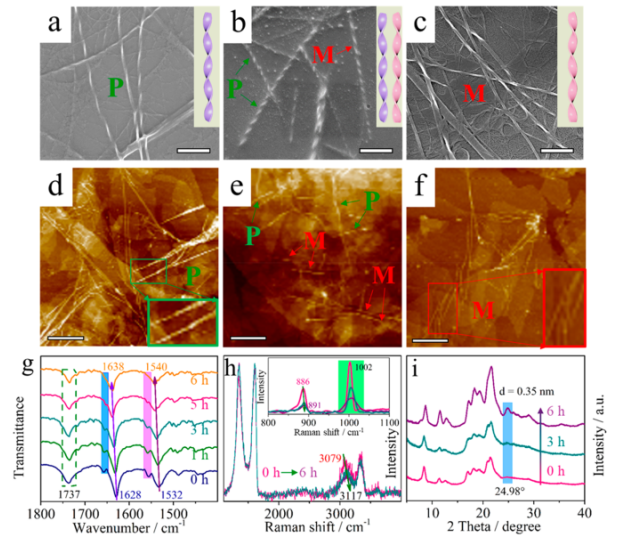 Figure 3.(a-c)LPFEG-GO干凝膠在不同的紫外線照射時(shí)間下的SEM圖像,(d)GO表面,(e)部分還原的GO表面和(f)RGO表面上組裝的LPFEG干凝膠的原子力顯微鏡圖像。LPFEG-GO干凝膠在不同輻照時(shí)間的(g)FTIR,(h)拉曼光譜和(i)XRD譜。