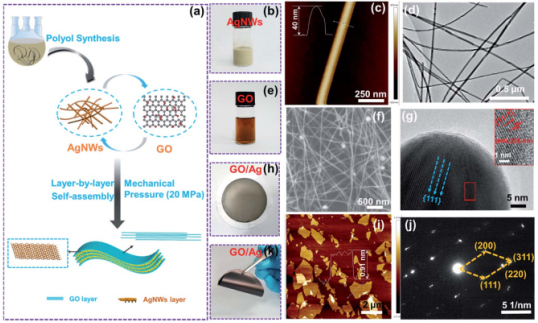 Figure 1. GO/Ag膜的制造過(guò)程示意圖(a)。 Ag NWs(b)和GO(e)組成部分的數(shù)碼照片。Ag NW(c)和GO薄片(i)的AFM圖。(f)Ag NWs的SEM圖像。(d-g)Ag NWs的高分辨率TEM圖像。(j)SAED圖。(h,k)GO/Ag薄膜在不同階段的數(shù)碼照片。