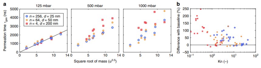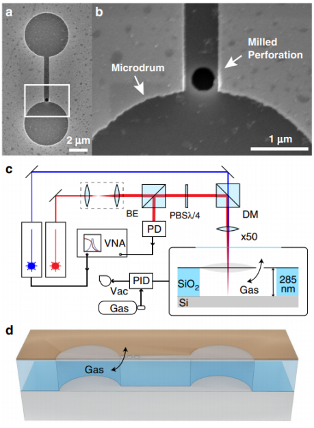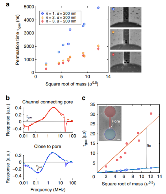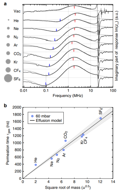 多孔,原子薄的石墨烯膜在過(guò)濾和篩分應(yīng)用方面具有有趣的特性。在這里,利用光熱力將氣體泵入石墨烯薄膜的納米孔中,從而能夠研究高于100 kHz頻率的氣體通過(guò)納米孔的情況。在這些頻率下,石墨烯的運(yùn)動(dòng)與通過(guò)納米孔的動(dòng)態(tài)氣流緊密相關(guān),因此可以用于研究納米級(jí)的氣體滲透。通過(guò)監(jiān)測(cè)驅(qū)動(dòng)力與膜機(jī)械運(yùn)動(dòng)之間的時(shí)間延遲,發(fā)現(xiàn)不同氣體通過(guò)直徑為10 ~ 400 nm的小孔的滲透時(shí)間常數(shù)有顯著差異。因此,提出了一種基于分子質(zhì)量區(qū)分氣體并研究氣體流動(dòng)機(jī)理的方法。所提出的基于微觀射流的氣體傳感方法為基于大規(guī)模質(zhì)譜和光學(xué)光譜的氣體表征方法提供了納米機(jī)械的替代方案。