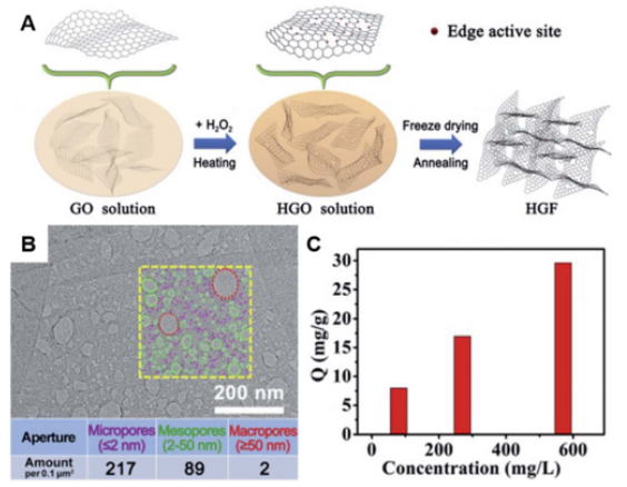 Figure 2.(A)示意圖描繪了HGF的制造過(guò)程。(B)HGO片的透射電鏡圖像。(C)HGF在不同濃度NaCl水性電解質(zhì)中的電吸附能力。