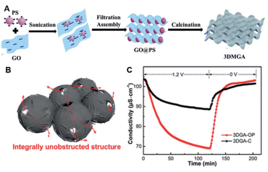 Figure 3.(A)3DMGA 制備示意圖。(B)在電容去離子期間3DGA-OP中離子傳輸過(guò)程。(C)3DGA-OP和3DGA-C電極在50 mg L-1 NaCl溶液中的溶液電導(dǎo)率與時(shí)間的關(guān)系曲線。