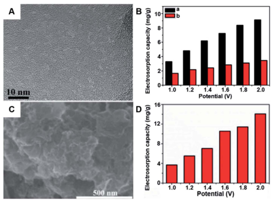 Figure 4. (A)表面微孔石墨烯的STEM圖像。(B)表面微孔石墨烯活性炭在50 mg L-1 NaCl水溶液中的電吸附能力。(C)HGC的SEM圖像和(D)電吸附能力。