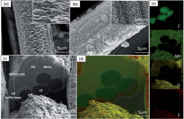 Figure 2.(a)VG@CF和(b)VMP陰極的SEM圖像。(c)VMP陰極的SEM橫截面圖。(d)VMP陰極的EDS映射圖像,以及(e)VMP陰極中C,Mn,O和S元素的映射。