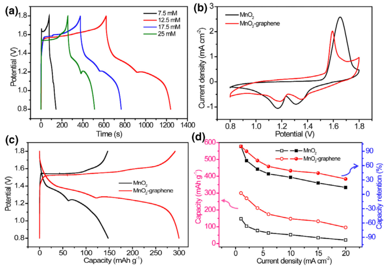 2-石墨烯電極的充放電曲線。(b)CV曲線;(c)在MnO