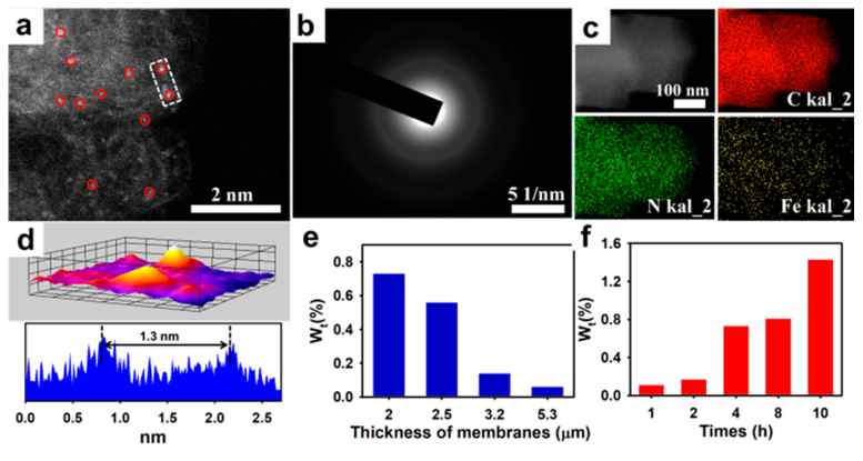 Figure 3. (a)HAADF-STEM圖像。(b)相應(yīng)的SAED。(c)C、N和Fe的EDS映射。(d)相對(duì)于a部分Fe SAs的相應(yīng)表面輪廓和距離輪廓。(e,f)在各種條件下SACs的鐵含量(e,合成具有不同厚度的GOM以制備SACs;f,合成厚度為2μm的GOM以制備在不同擴(kuò)散時(shí)間的SACs)