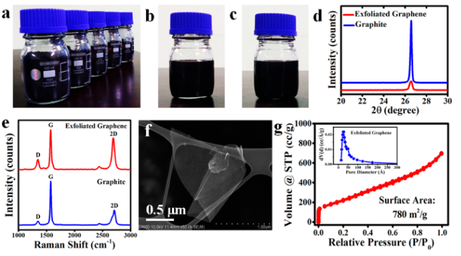 Figure 1. (a)等離子噴涂剝落石墨烯的照片。石墨烯在(b)有機溶劑N-甲基吡咯烷酮(NMP)和(c)二甲基甲酰胺(DMF)中的分散。(d,e)剝離的石墨烯和石墨的X射線衍射(XRD)和拉曼光譜。(f)SEM圖。(g)石墨烯的氮吸附/解吸等溫線。