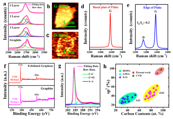 Figure 3. 石墨烯薄片的(a)拉曼光譜,由拉曼圖衍生的(b)G和(c)D波段強度。(d)中部和(e)邊緣收集的拉曼光譜。(f)石墨烯的 XPS光譜。(g)C 1s XPS光譜。(h)GO,rGO,電化學(xué)剝離石墨烯(EcG),液相剝離石墨烯(LPEG),化學(xué)氣相生長石墨烯(CVD)中sp2和C含量進行比較。