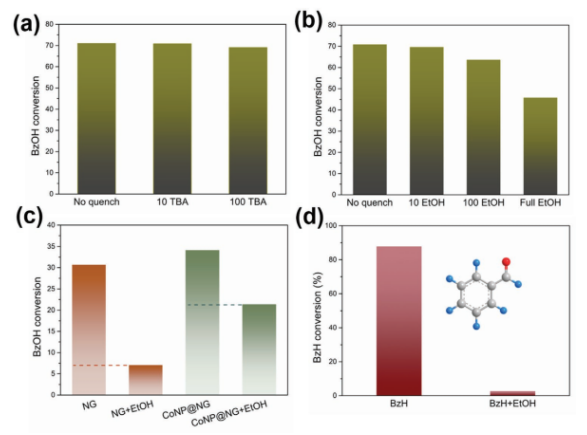 Figure 3. SACo@NG表面上氧化BzOH時,自由基清除劑對該反應(yīng)的影響。a)叔丁醇用量,b)乙醇用量。 c)在NG和CoNP@NG上氧化BzOH時,全部EtOH劑量對該反應(yīng)的影響。d)在SACo@NG上氧化BzH時, 全部EtOH劑量對該反應(yīng)的影響。