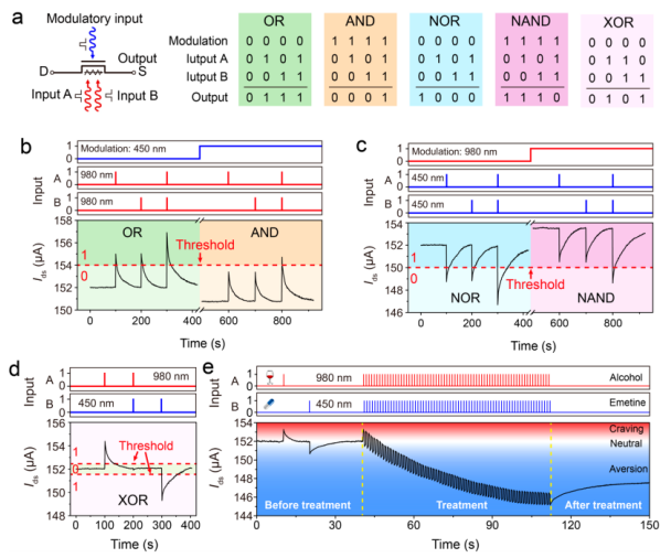 集成了突觸和光感功能的光電突觸在神經(jīng)形態(tài)計算、視覺信息處理和復(fù)雜的學(xué)習(xí)、識別和記憶方面表現(xiàn)出巨大的優(yōu)勢。然而,現(xiàn)有的光電突觸要實現(xiàn)雙向權(quán)值更新,仍然需要電刺激,這限制了器件的處理速度、帶寬和集成密度。在本文中,提出了一種基于晶圓尺寸的芘基石墨炔/石墨烯/ PbS量子點異質(zhì)結(jié)構(gòu)的雙端光學(xué)突觸,該突觸可模擬光路中的興奮性和抑制性突觸行為。異質(zhì)結(jié)構(gòu)的簡單設(shè)備架構(gòu)和低維特征使光學(xué)突觸具有可穿戴電子設(shè)備的強大靈活性。這種光學(xué)突觸具有線性和對稱的電導(dǎo)更新軌跡,具有許多電導(dǎo)狀態(tài)和低噪聲,這有利于展示準確和有效的模式識別,即使在彎曲狀態(tài)下也具有很強的容錯能力。光學(xué)路徑中的光學(xué)突觸已經(jīng)證明了一系列邏輯功能和聯(lián)想學(xué)習(xí)能力,從而極大地增強了神經(jīng)形態(tài)計算的信息處理能力。在此基礎(chǔ)上,構(gòu)建了基于光學(xué)突觸陣列的可視化信息感知記憶處理集成系統(tǒng),實現(xiàn)了實時檢測、原為存儲和圖像處理。在受光遺傳學(xué)啟發(fā)的可穿戴電子設(shè)備的神經(jīng)形態(tài)計算和自適應(yīng)并行處理網(wǎng)絡(luò)發(fā)展上,這項工作邁出了重要一步。