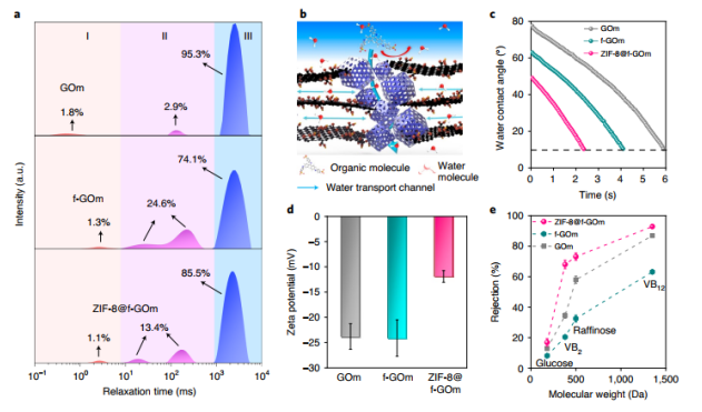Figure 4. ZIF-8@f-Gom分離機(jī)制示意圖。a,1H時(shí)域核磁共振譜圖。b,ZIF-8@f-GOm分離機(jī)理示意圖和跨膜的水傳輸過(guò)程。c,GOm,f-GOm和ZIF-8@f-GOm表面的動(dòng)態(tài)水接觸角。d,GO基膜表面電荷的近似值。e,中性電荷有機(jī)分子的分離過(guò)程。