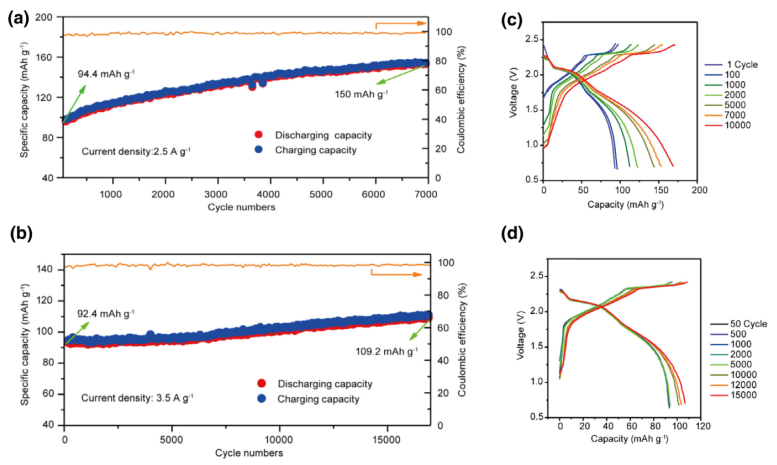 Figure 1. (a)由鎳集流體、石墨烯織物正極和Et-1.5電解質(zhì)制成的電池和(b)由石墨烯織物正極和Emi-1.5組裝而成的電池的恒電流循環(huán)。(c)和(d)是它們在不同周期下的典型恒電流曲線。