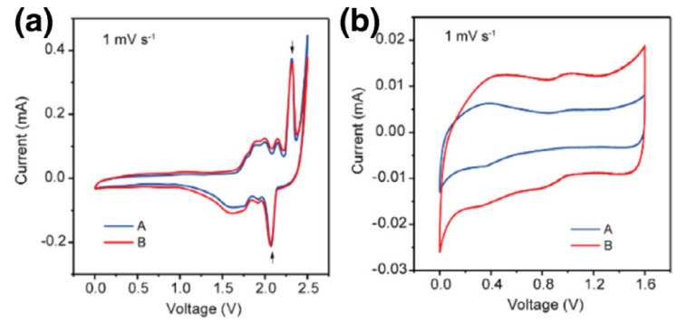 Figure 2. 在(a)0–2.5 V和(b)0–1.6 V的掃描電壓范圍內(nèi)的循環(huán)伏安圖(CV)曲線