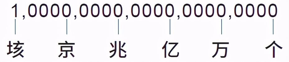 其實(shí),我們祖先的智慧同樣高明,在創(chuàng)造大數(shù)字表達(dá)時(shí)也是有節(jié)奏的。在數(shù)字表達(dá)上英文是每3位數(shù)升一個(gè)級(jí),中文是每4位數(shù)升一個(gè)級(jí)。我們祖先創(chuàng)造出表達(dá)數(shù)字的漢字是“個(gè)、十、百、千、萬(wàn)、十萬(wàn)、百萬(wàn)、千萬(wàn)、億、十億、百億、千億、兆、十兆、百兆、千兆、京、十京、百京、千京、垓、十垓、百垓……”。